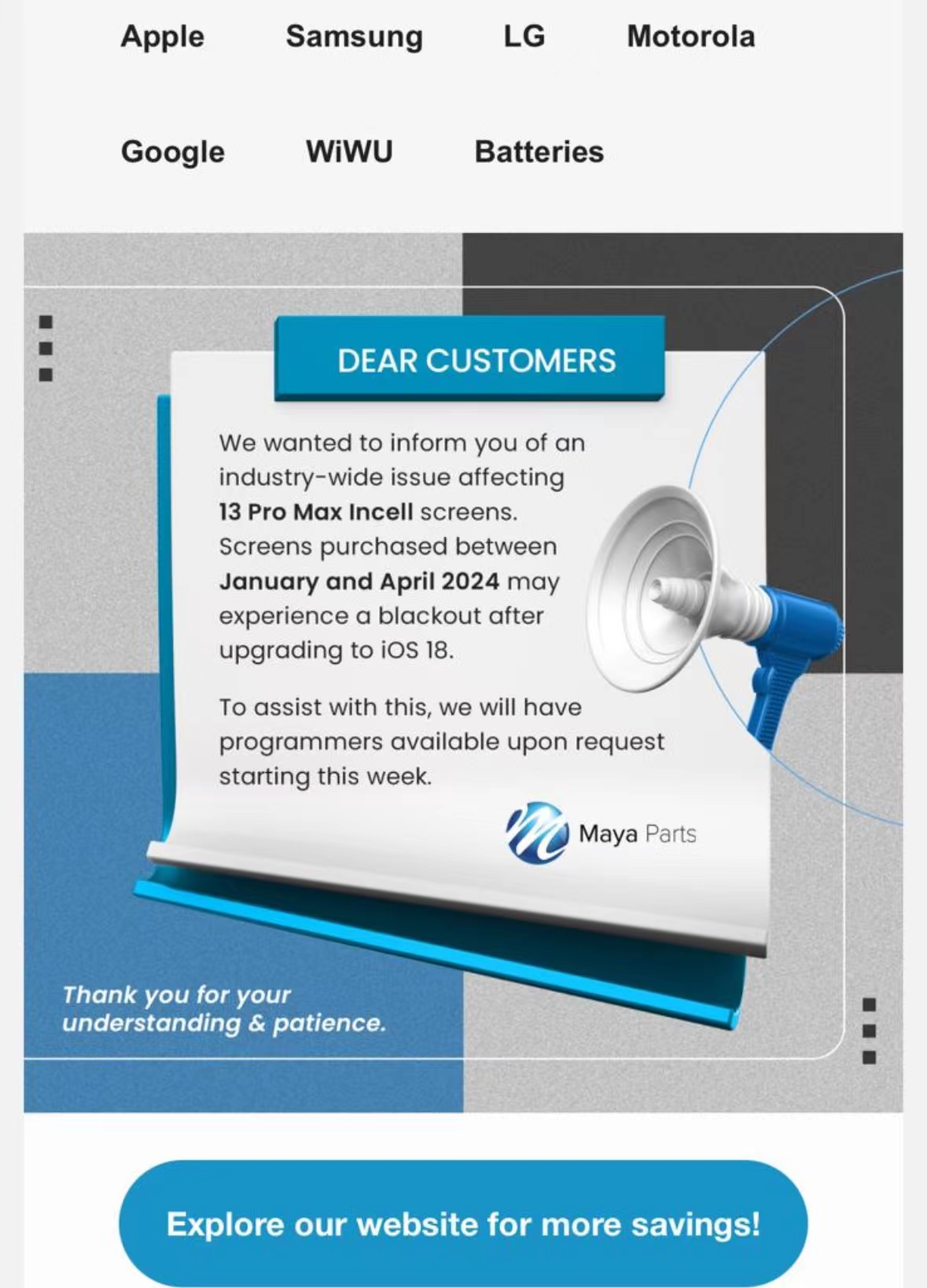 A news notice that after the after-market 13Promax IN cell screen for iPhone is updated to the iOS 18 system, it goes black and the power is cut off. How to solve this problem?
