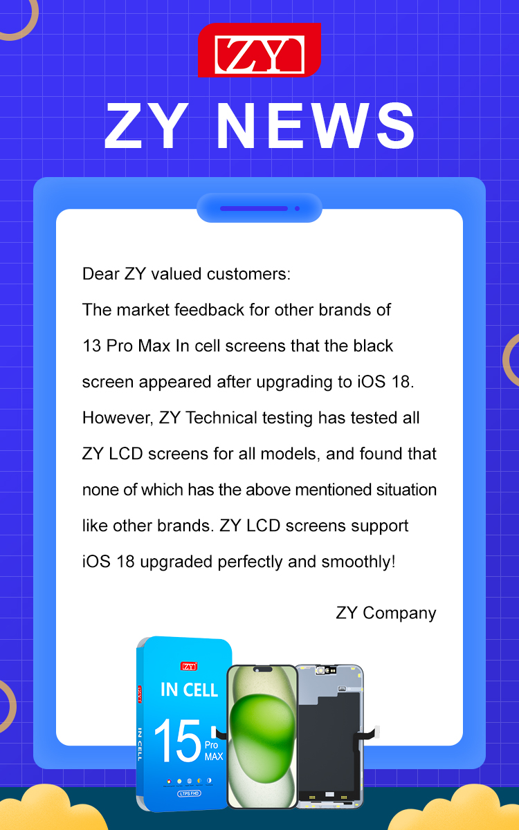 In response to this abnormal situation, ZY R&D tested the LCD screens for all models. Now ZY issues a notice that all iPhone series of ZY LCD screens support iOS 18 upgrading perfectly and smoothly! ZY is the first one in the market to support iOS 18 upgrading.